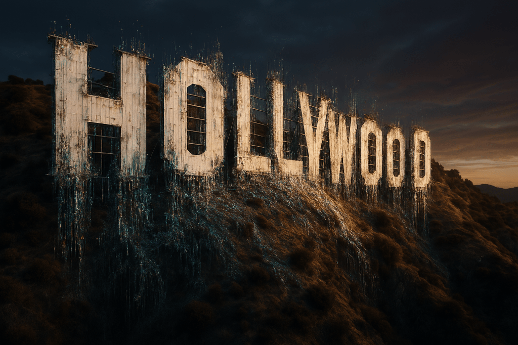 Decaying Hollywood sign at dusk, representing the entertainment industry’s moral collapse and its growing role in normalizing child grooming, ideological manipulation, and the erosion of childhood innocence.