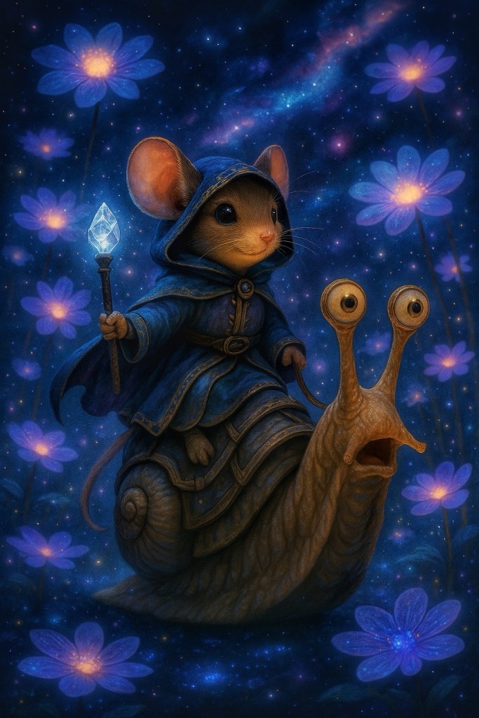 A tiny wizard mouse rides a startled snail through a glowing dreamscape of flowers and stars—proof that magic can come in small, unexpected forms. AI-generated fantasy artwork.
